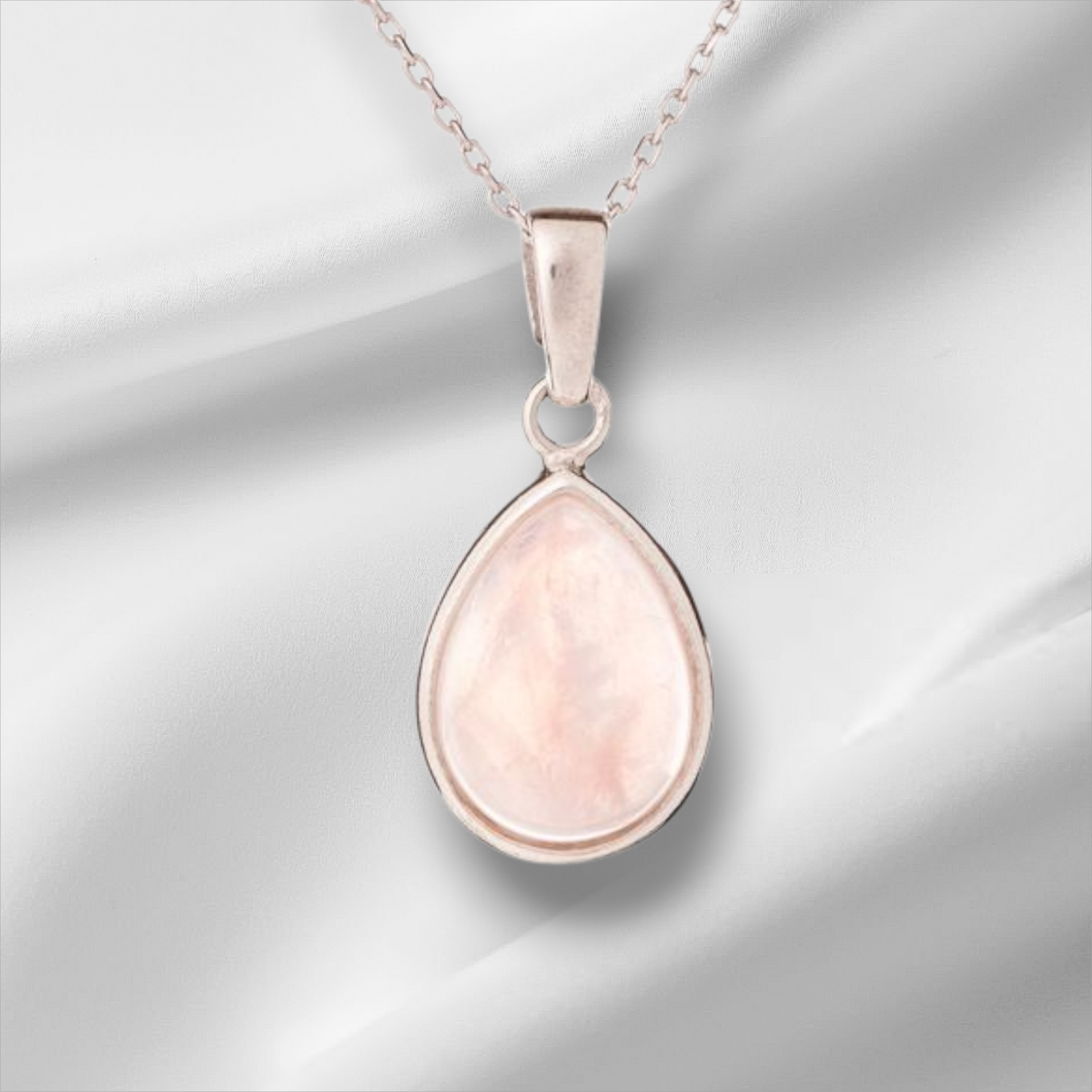 Pendentif en forme de goutte avec un quartz rose, en argent rhodié 925.